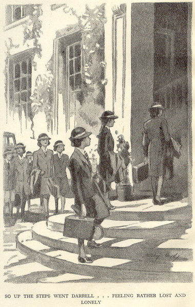 Darrell heading into Malory Towers for the first time by illustrator Stanley Lloyd.