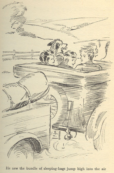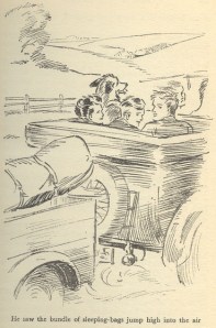 Mr Luffy drives a bit too fast in “Five Go Off to Camp” forgetting he’s pulling a trailer full of camping supplies behind the car! Illustrated by Eileen Soper.