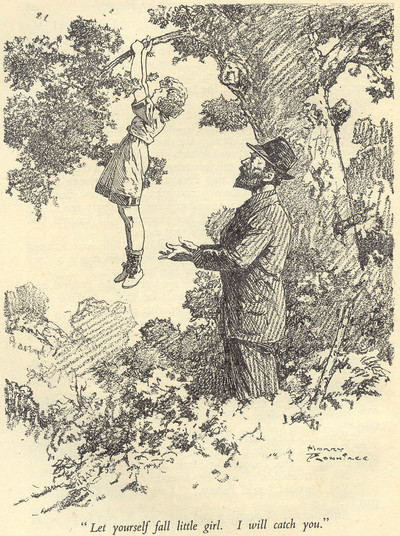 Penny feels quite sorry for herself and decides to set out all alone, without telling anybody, to find the others. Soon she becomes hungry, tired, and worst of all lost and tries to climb a tree to get a view over the whole countryside and find out where the others are. Being a town girl who has never climbed a tree in her life she finds herself hanging in mid-air when the branch she has been standing on breaks! She gives a loud scream but suddenly hears a voice beneath her. “Let yourself fall, little girl. I will catch you. You will be quite safe.” Her arms suddenly gave way but she finds herself in the arms of a man with long hair and queer eyes. The man carries her through the bracken and heather then he asks why she came so far all alone.