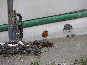 On the other side of the train tracks the River Thames flowed on by, a steely grey, almost eerie as it felt very different to the busy river of the summer and autumn that I have gotten used to seeing. As we stood taking in the scene before us, the hills on the other side of the river shrouded in mist from the snow clouds, no ducks quacking away in the water, my eye was drawn to the sight of a beautiful little red breasted robin bobbing up and down from the docking point in front of us. He stood out beautifully from the white and green boat.