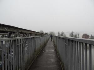 We had to be careful climbing the steps as they were slippy; not so much because of the snow, but because they were wet. We couldn’t even hold on to the hand rail because that was horribly cold, and our gloves would have gotten soaked. Still we made it up on to the bridge in one piece and the world was white as far as the eye could see. There was a certainly an oppressive feel to the weather now.