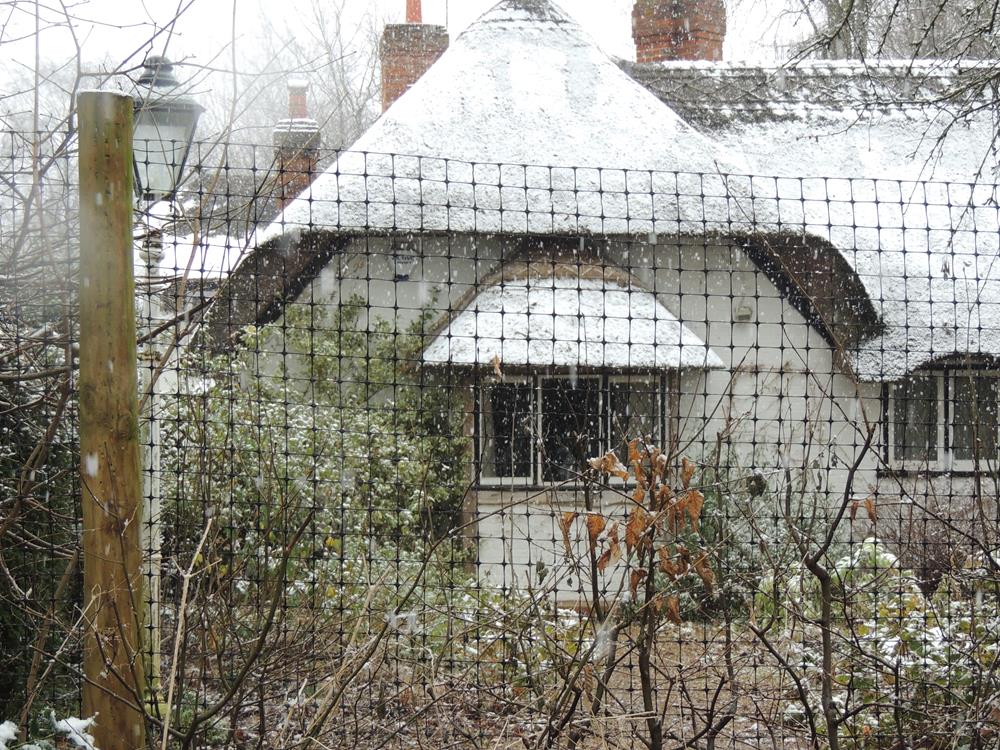 When we got there we arrived to a flurry of snow flakes, and as I parked my car I regretted having not brought an umbrella. Not to keep me dry, but to keep my camera from getting too wet. To start our visit I dragged Catherine back up the way we had come to see what we could of Enid Blyton’s old home, Old Thatch.