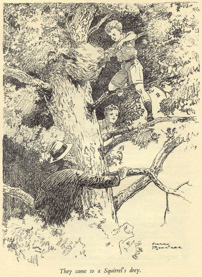 When Tammylan does reveal himself he makes a delicious lunch for the two boys out of mushrooms, roots and leaves. After their rather strange but tasty meal they go to find Bushy (remember the squirrel that was on Benjy’s shoulder?) and his wife’s nest. Soon, when they have climbed the tree they see the squirrels nest, a woven masterpiece of bark, twigs and grass.