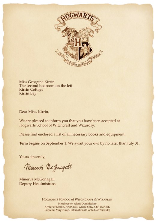 We are pleased to inform you that you have been accepted at Hogwarts School of Witchcraft and Wizardry. Please find enclosed a list of all necessary books and equipment.