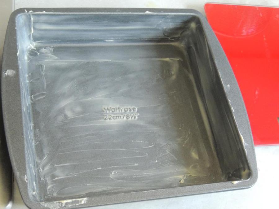A greased pan for setting the sugar mix