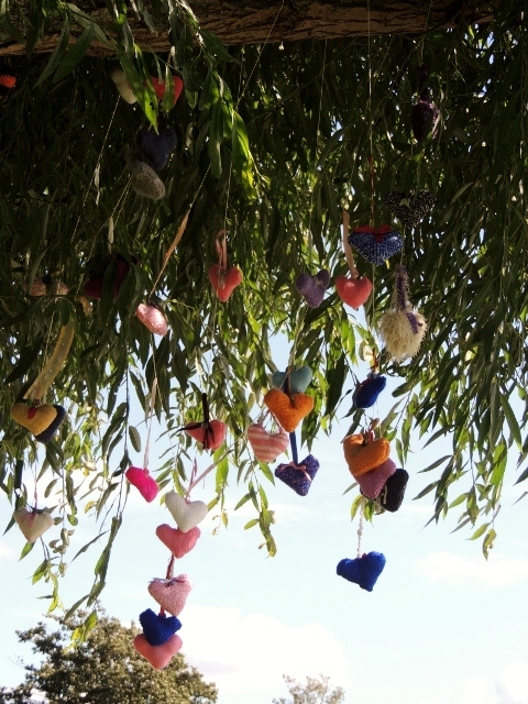 Knitted hearts hanging from a willow tree