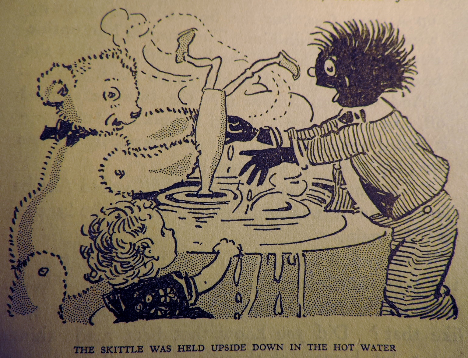 She and the imp dislike each other, and Amelia Jane is unable to stop him taking her shoes. He at least gives her a way to get the thimble off the skittles head though – heating it up so that it expands! (Rather a scientific answer rather than the magic one would expect from an imp.)