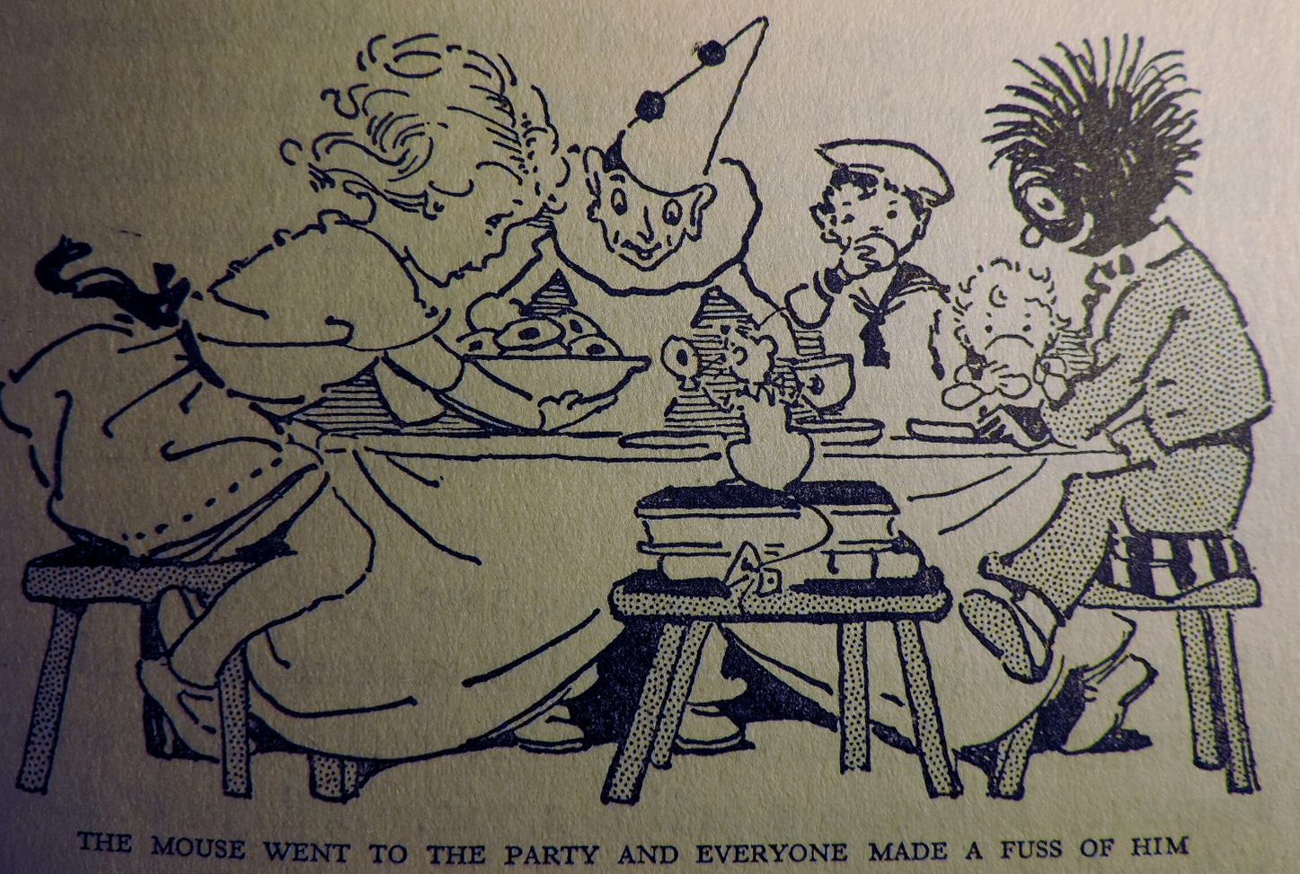 This story has the doll showing off her knitting skills. Unfortunately she knits all sorts of things into the long, long (Dr Who-esque) scarf, including a hair-ribbon, some bootlaces and the clock-work mouse’s tail. The toys use her knitting to tie her to the table, and only let her free when she agrees to knit them all new clothes… only she deliberately makes them too big, too small, or with extra armholes!