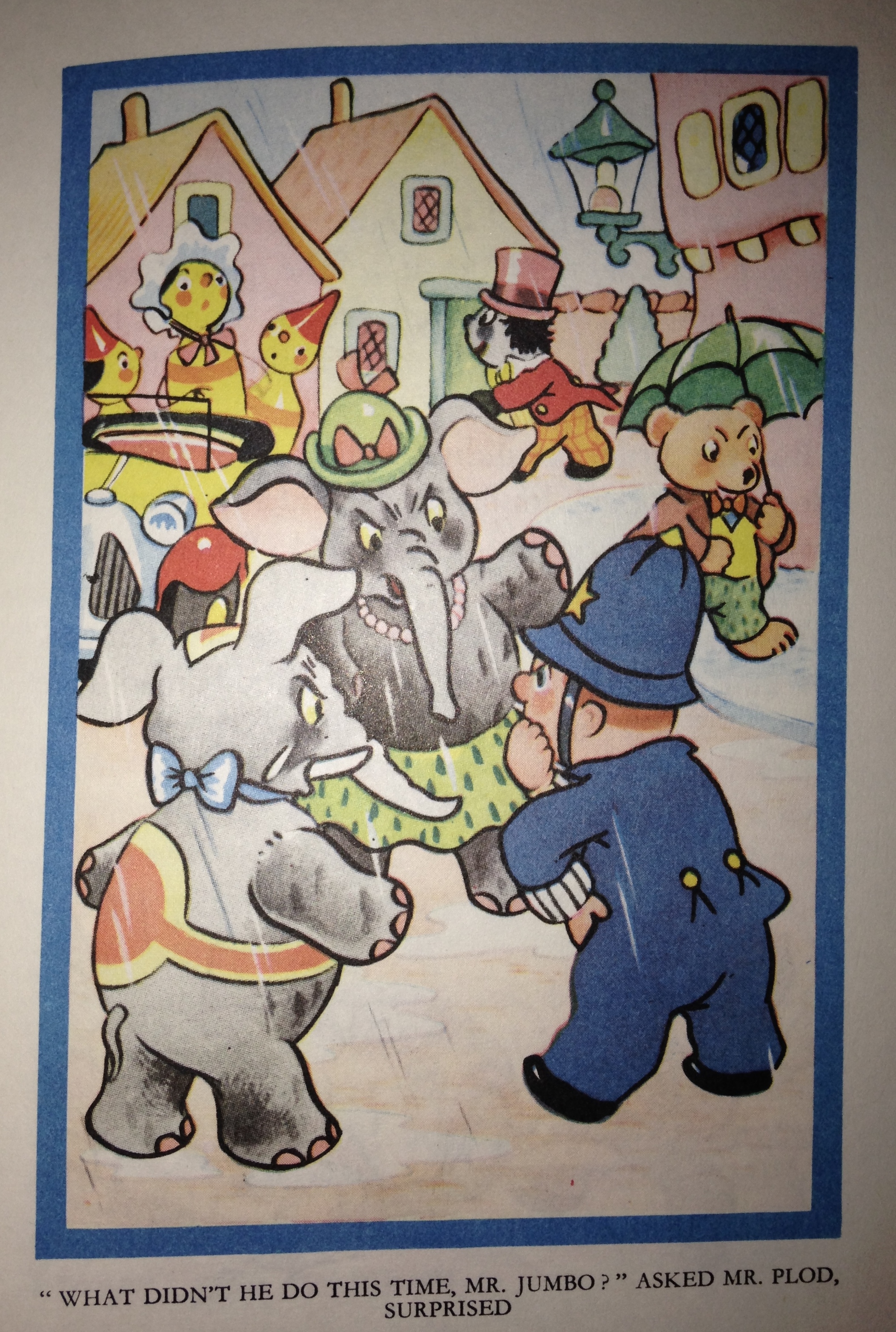 Mr Plod just keeps on turning up – he’s around when an umbrella wielding passenger makes Noddy crash into a fruit stall and again when Noddy tries to cheer himself up by splashing his car through the puddles and accidentally soaks Mr and Mrs Jumbo. After that it goes down in Mr Plod’s little notebook that Noddy is due one good spanking (bet that becomes a scolding in the reprints!)