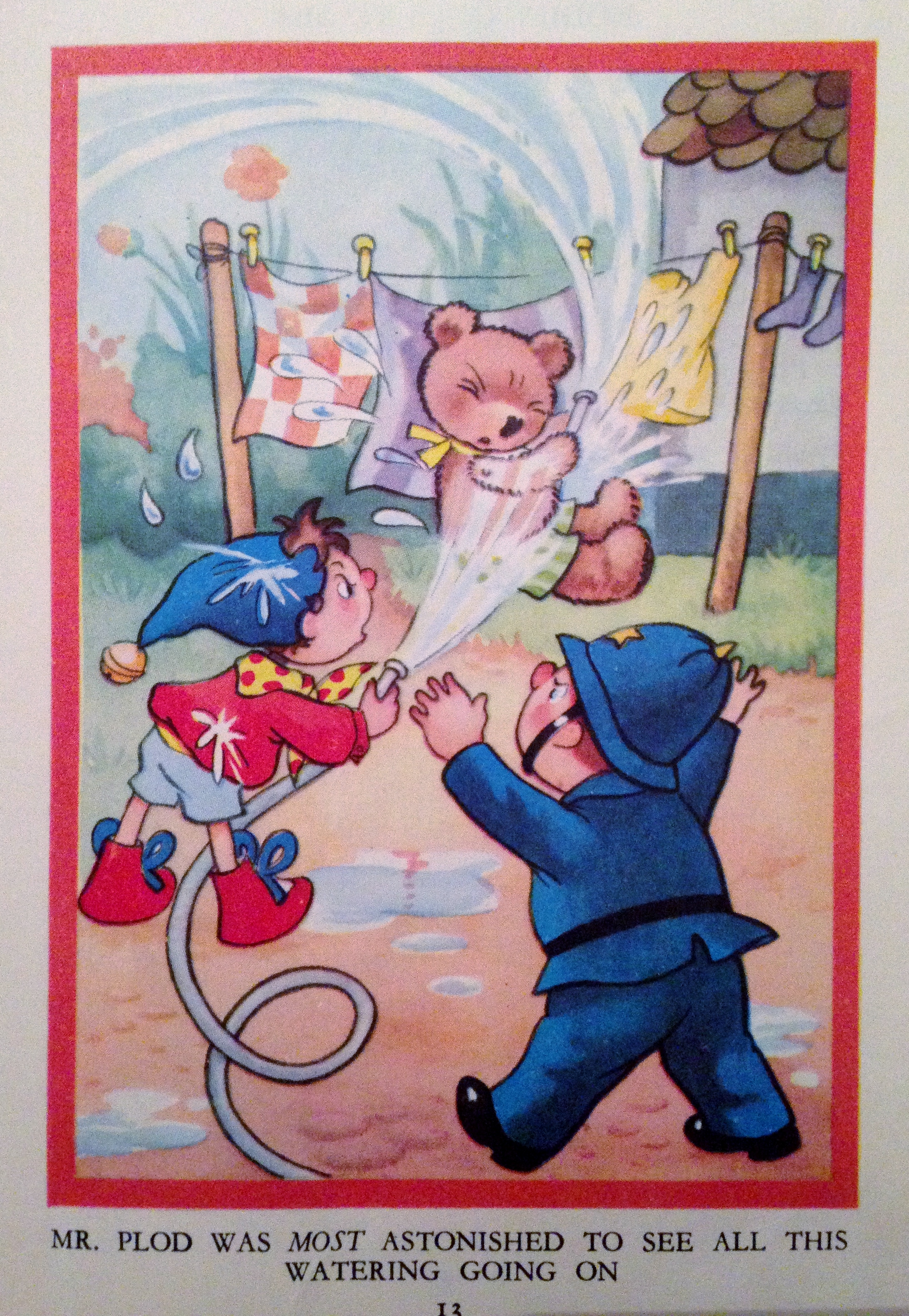This starts off like several others, with Noddy getting up and getting on with his usual activities and thinking it’s a wonderful day. And, as always, it goes quickly wrong and he manages to get himself in trouble with Mr Plod who seems to always turn up at the worst moment for Noddy. This time it’s because Tubby Bear next door is being naughty and waters his mother’s washing and Noddy’s too. Being a childish toy, Noddy retaliates and ends up soaking the police man, naturally.