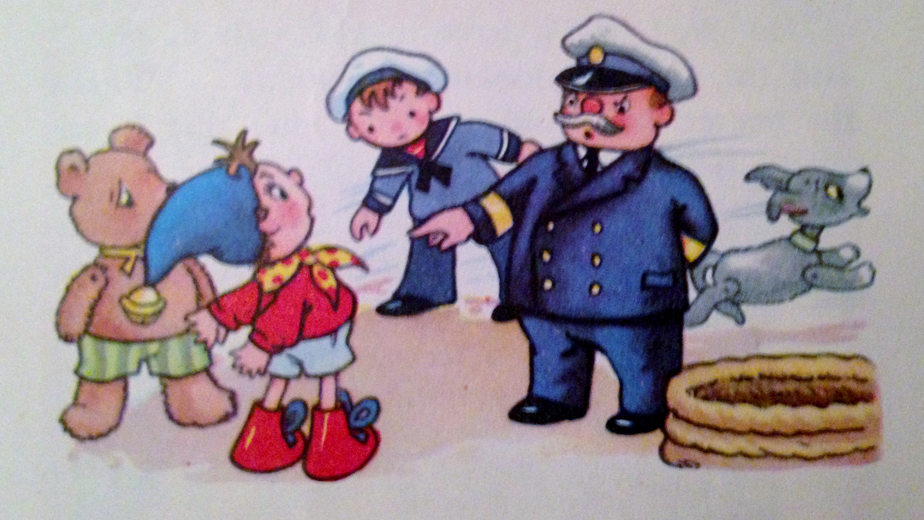 The car gets towed along behind, and Bumpy-Dog is hauled up via a rope, just in time to face the loud-voiced captain who thinks they’re all stow-aways. Tubby Bear signed up to be a deck-hand and gets put to work and Noddy ends up having to be a cabin-boy, though he’s told to STOP NODDING YOUR HEAD AT ME by the captain.
