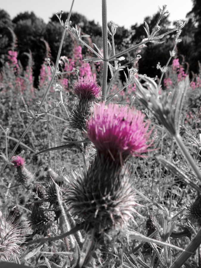Black white and pink thistles