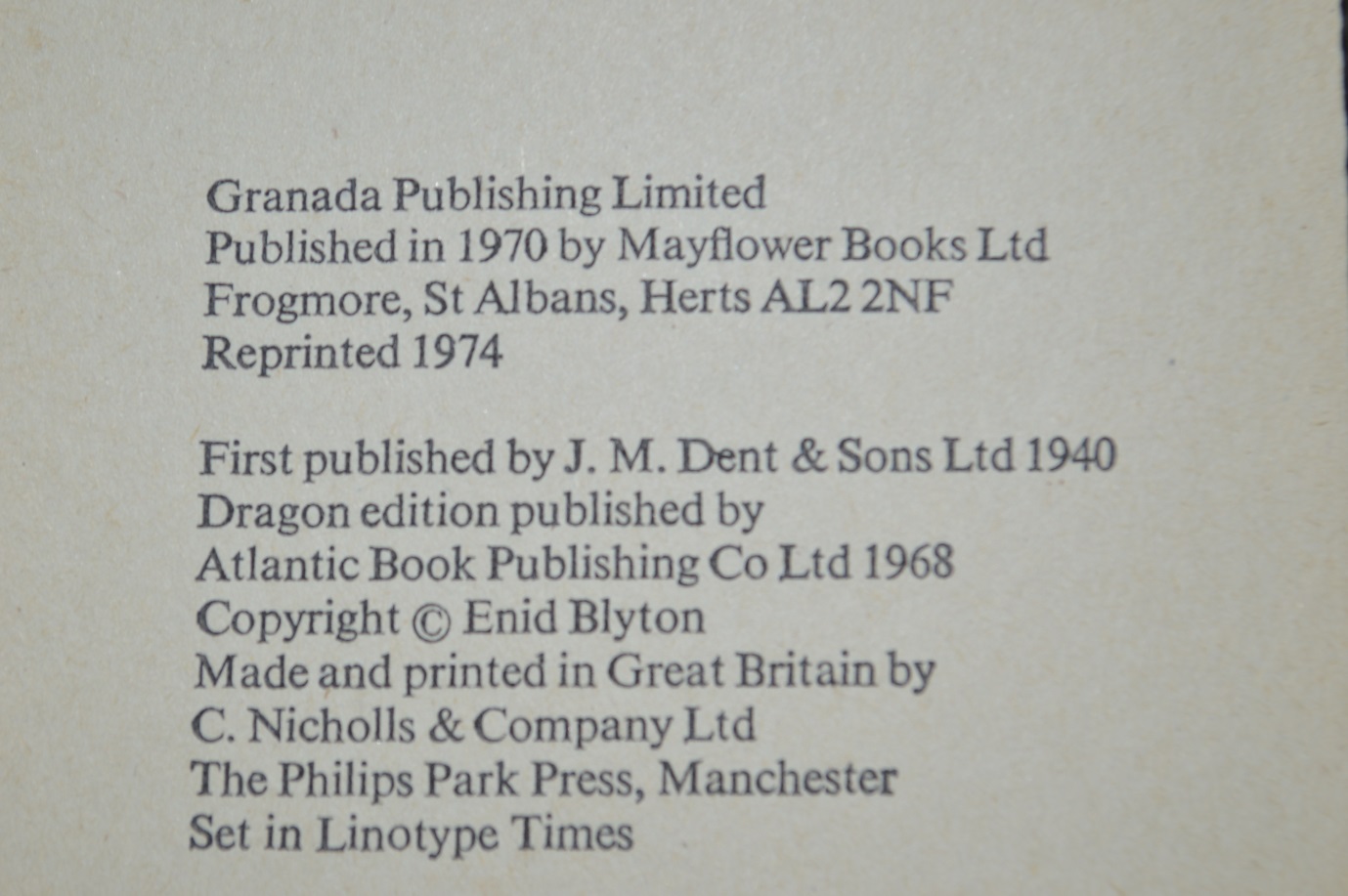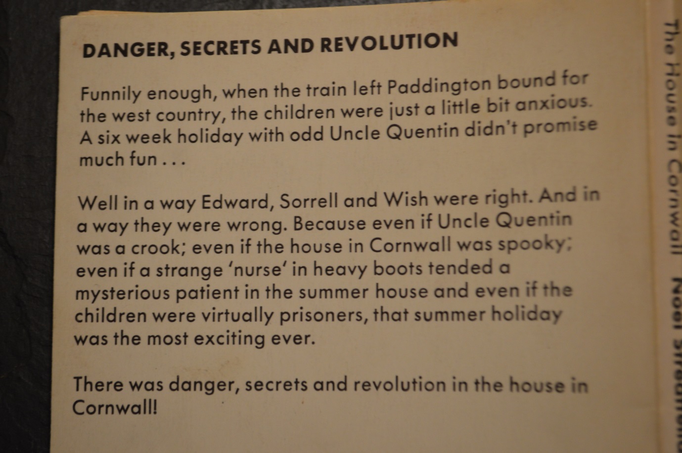 What has this got to do with Enid Blyton? Well, in the edition I have (Mayflower/Dragon 1970, reprinted 1974) the inside cover credits the copyright to her. That is strange enough, but perhaps could be dismissed as just a typesetter’s error since Blyton’s work was published under the same imprint. Far more peculiar is the back cover blurb, which describes how the children have to stay not with Uncle Murdock but with Uncle Quentin! How could such an error have been made? Not once but twice Uncle Quentin’s name appears on the back cover and it would seem truly bizarre that someone could have written a text which in all other respects relates to Streatfeild’s book but inadvertently mentions a character in another book by another author*. I am not the first person to notice it – there is a discussion on the Enid Blyton Society Forum of just this, where the consensus of opinion is that it is an inexplicable mistake.