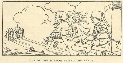 Thanks to another purchase from the Land of Spells they escape on an upside down flying table and a flying bench, and the children land in their own garden. Their surely too dim to be real mother is only mildly surprised by this!