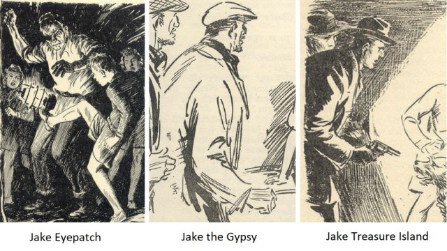 After the Jacks, we have the Jakes. Jakes are not main characters, but they are all villains. There is Jake-with-the-eyepatch from The Island of Adventure who is entirely different from Jake-the-Gypsy from Five Fall Into Adventure, and neither have anything to do with another Jake from the Famous Five, Jake-the-main-villain from Five on Treasure Island.