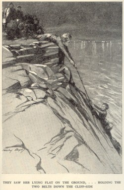 Below; Daphne wraps her feet around a gorse bush and takes Mary-Lou’s weight on her coat’s belt to stop her sliding down the cliff.