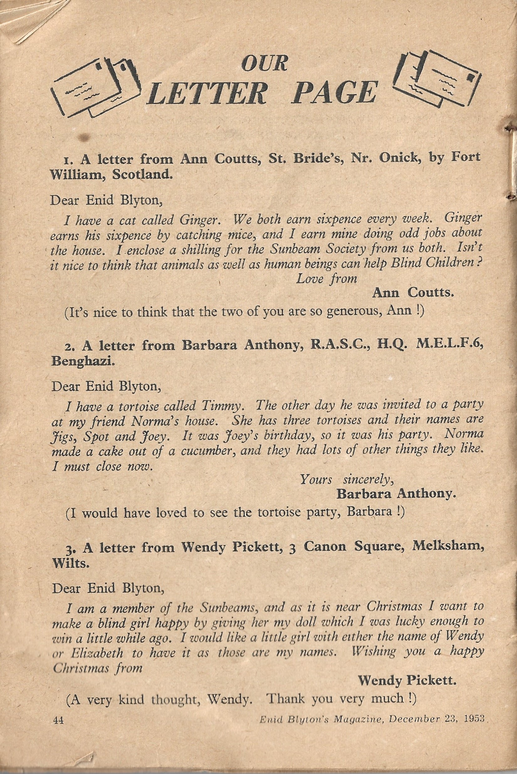 I am a member of the Sunbeams, and as it is near Christmas I want to make a blind girl happy by giving her my doll which I was lucky enough to win a little while ago. I would like a little girls with either the name of Wendy of Elizabeth to have it as those are my names. Wishing you a happy Christmas from