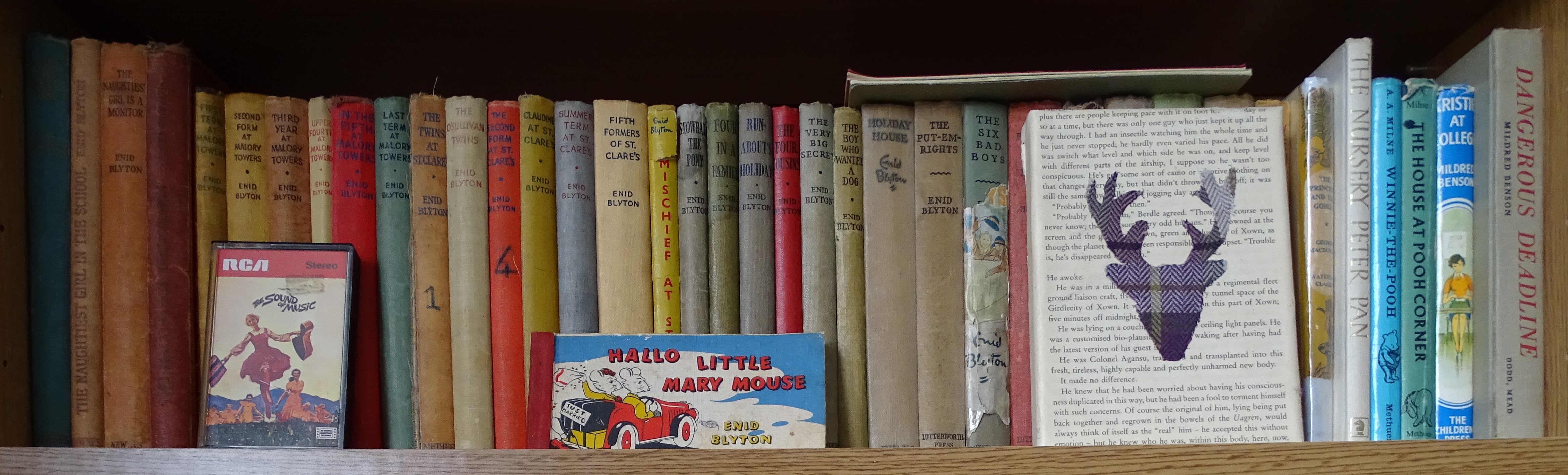 Shadow the Sheep Dog (because it is tall…) then three Naughtiest Girl books, the six Malory Towers titles and the six St Clare’s books, plus Mischief at St Rollos which although a Mary Pollock title is also set in a school.