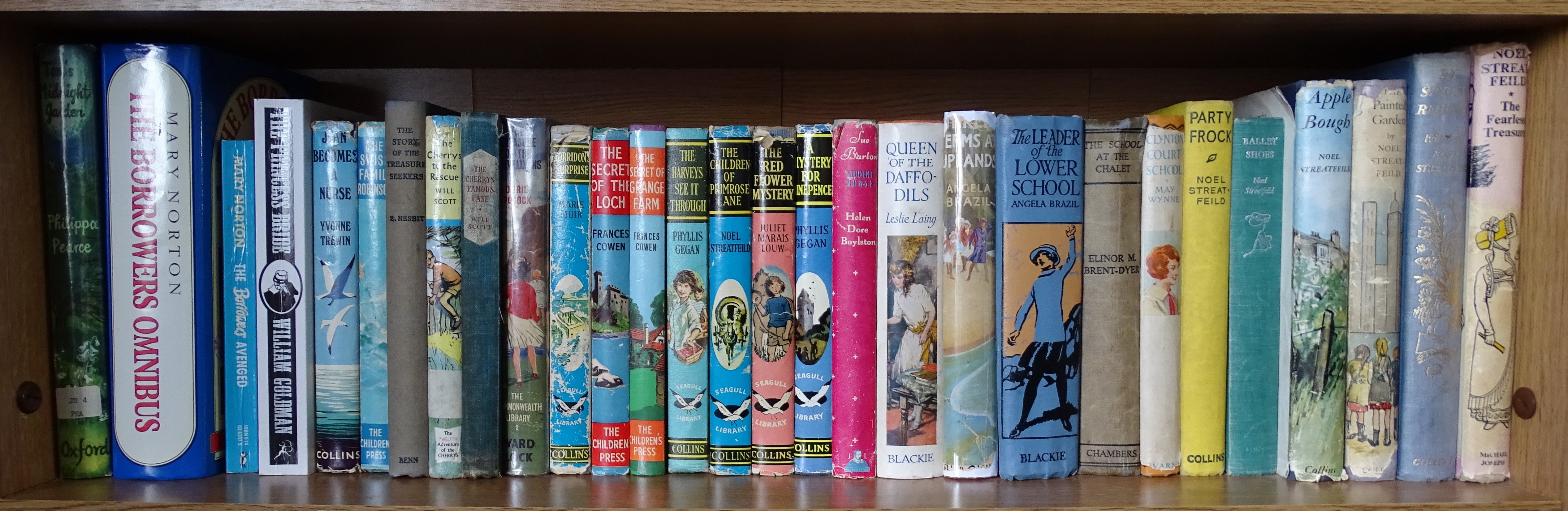 Then I have some Collin’s Seagull Library books, I love the spines on these and can’t resist if I see them going cheaply in charity shops. They are The Harveys See it Through by Phyllis Gegan, The Children of Primrose Lane by Noel Streatfeild (I have more of hers further along the shelf), The Red Flower Mystery by Juliet Marais Louw, and A Mystery for Ninepence by Phyllis Gegan.