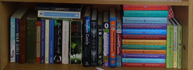 Then a whole load of Daniel Handler/Lemony Snickets. The All the Wrong Questions series and A Series of Unfortunate Events, plus a couple of additional titles which come into the same universe. On top of the last books is a little beanbag heart I made years ago.
