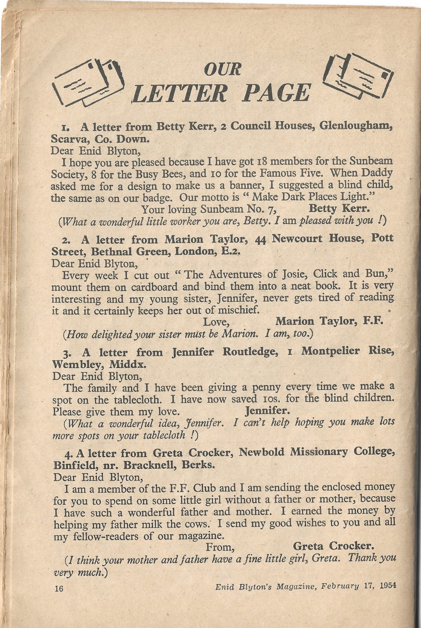 Now I know that Enid chose her winning letters from the ‘normal’ ones she received, not ‘special’ ones written with the hope of appearing on the letters page. But I can’t help but notice that an awful lot of the featured letters are ones saying “I earned X money by doing X clever thing and I would like it to go towards X cause.” If those aren’t letters hoping to win, then I would like to see the obvious ‘special letter’ attempts!