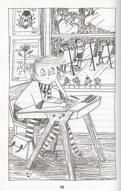 Hindley shows Elizabeth stuck inside at her desk while her class sketch outdoors.