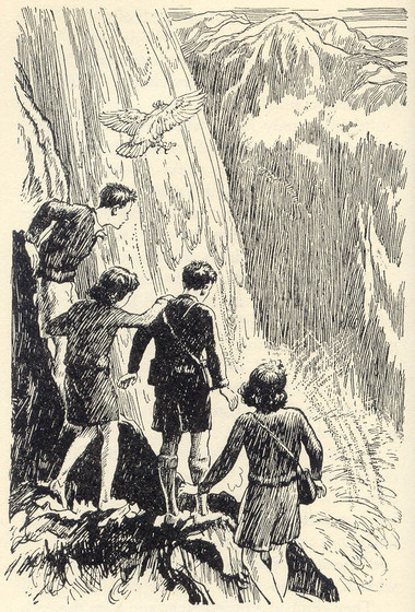 It was a waterfall – but what a big one! It fell from a great height, almost sheerly down the mountainside, and cascaded far below them, fine spray rising high in the air. It wetted their faces as they stood there, and yet they were quite a good way from the mass of water.