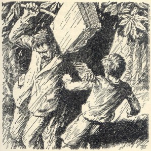 The wind howled round and shook the tree violently. Something fell from the tree and hit the raging man full on the shoulder. He dropped down at once, shouting, clutching at his shoulder. Jack sped off into the wind. He turned and looked back. Pepi was trying to get up, groaning. The wind howled again, and the big tree spat out something else that hit Pepi on the head. He fell back and did not move.