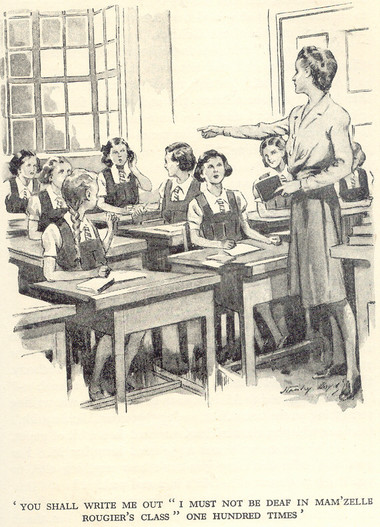 June’s next trick involves a very powerful magnet. She knows that any mistress would suspect a trick if she plays it, so she gives it to Susan who uses it to pull all the pins out of Mam’zelle Rougier’s neat little bun at the end of a French class. Of course her bun completely unravels and she is alarmed to think perhaps she forgot to pin her hair up that morning as there are certainly no pins there now.