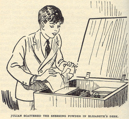 The third form sees the girls deploying some sneeze pellets. These have been sent by one of Alicia’s other brothers, and once wet they produce a vapour that causes whoever is within four feet to sneeze like mad. They play it on Mam’zelle Dupont of course, and she ‘snizzes’ over and over, so much she falls off her chair. Miss Pots comes to investigate the noise and then she is overcome with sneezes too. Mam’zelle looks so ill that Matron is sent for and then she starts sneezing too. It’s a wonder none of the girls had rolled onto the floor with laughter.