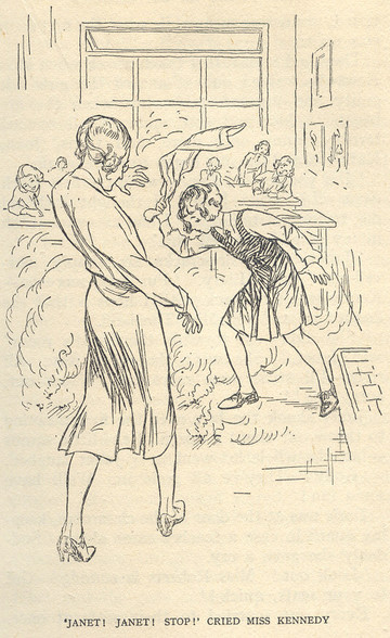 First Janet puts firecrackers up the chimney to give Miss Kennedy a fright. Miss Kennedy is a bit of a poor soul and doesn’t cope well with the sudden explosions. Foolishly Janet tips the rest of the box in and when Miss Roberts comes back they all explode and she is furious.