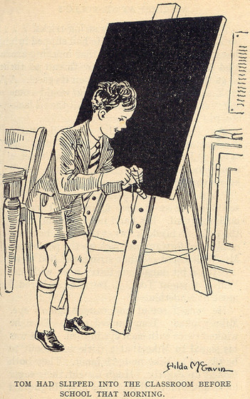 Mam’zelle suspects the sixth-formers have tricked her, but of course they haven’t and know nothing of snake-pellets. They are therefore amazed when Nora arrives to steal Mam’zelle’s second lot of hair pins and place a second pellet and pin cushion behind the blackboard.