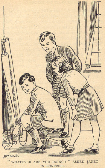 There’s a couple of tricks in Mischief at St Rollo’s played by Tom Young. First he ties some cotton-reels to thread, puts them in a cupboard and then runs the thread to his desk so he can jiggle them from afar. He does this in Monsieur Crozier’s class (what is it with school kids playing tricks on the French teachers?) and causes alarm at the suggestion it may be mice. He actually then pretends to have found a mouse and chases it all over the classroom, landing himself in rather a lot of trouble.