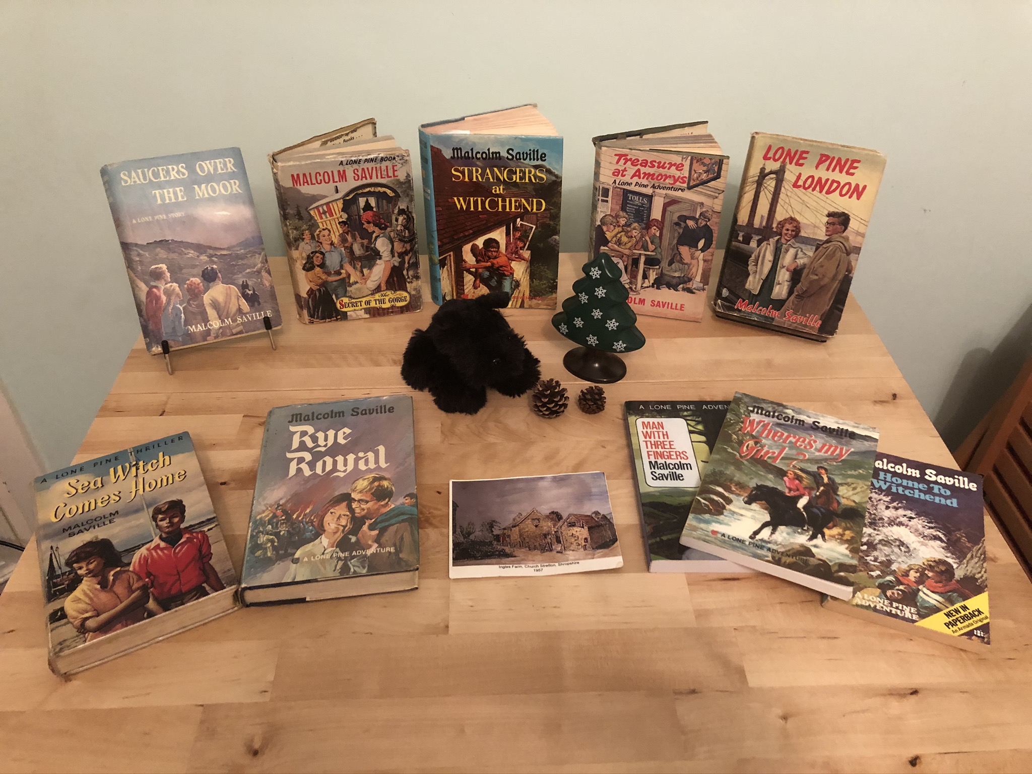 A selection from the 20 Lone Pine books (the ones I have with dust jackets or printed covers!). A little Mackie, a lone pine tree and some pine cones plus a postcard of Hemperley Farm in Church Stretton aka Ingles Farm in the books.