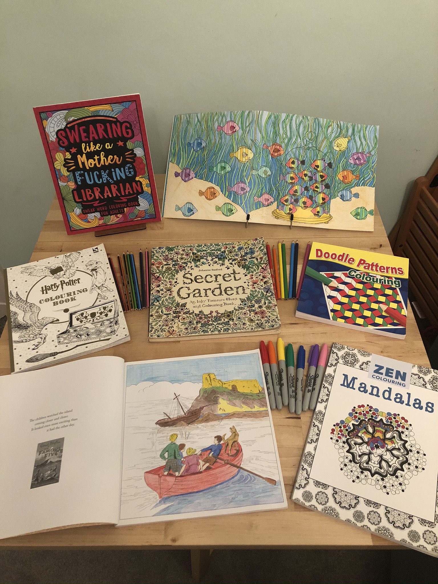 You can’t borrow colouring books from the library but lots of libraries do colouring in groups for adults as well as children. At the front you can see my Famous Five colouring book – I have since finished colouring in the sea!