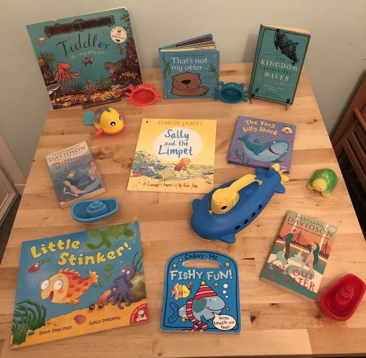 A mix of children’s and grown up’s books here, with some of Brodie’s bath toys. Sally and the Limpet is accompanied by a song in our house which begins Sally and the limpet, the limpet, the limpet, Sally and the Limpet, sung to the tune of Following the Leader from Disney’s Peter Pan. It may have had more words but I’m not sure.