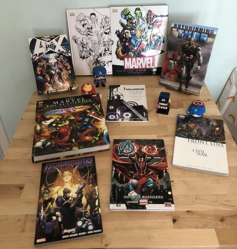 An array of Ewan’s graphic novels and guides to the Marvel universe and characters.