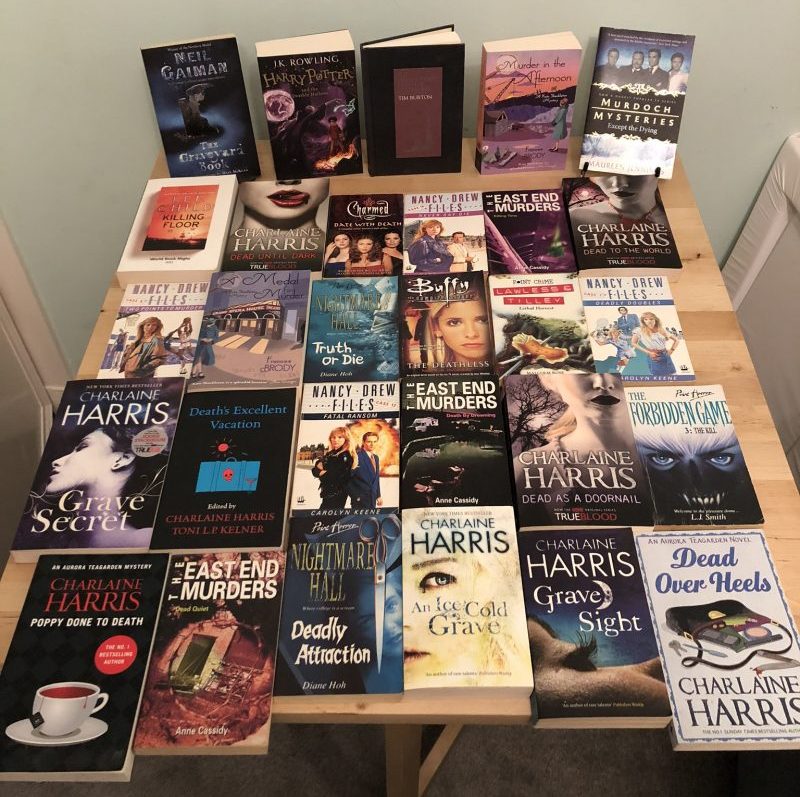 Various books with death, murder, deadly, dead etc in the title. Mostly from Charlaine Harris, Nancy Drew, Charmed and Point Horror/Crime but also Harry Potter, Kate Shackleton by Frances Brody, Lee Child and Neil Gaiman.