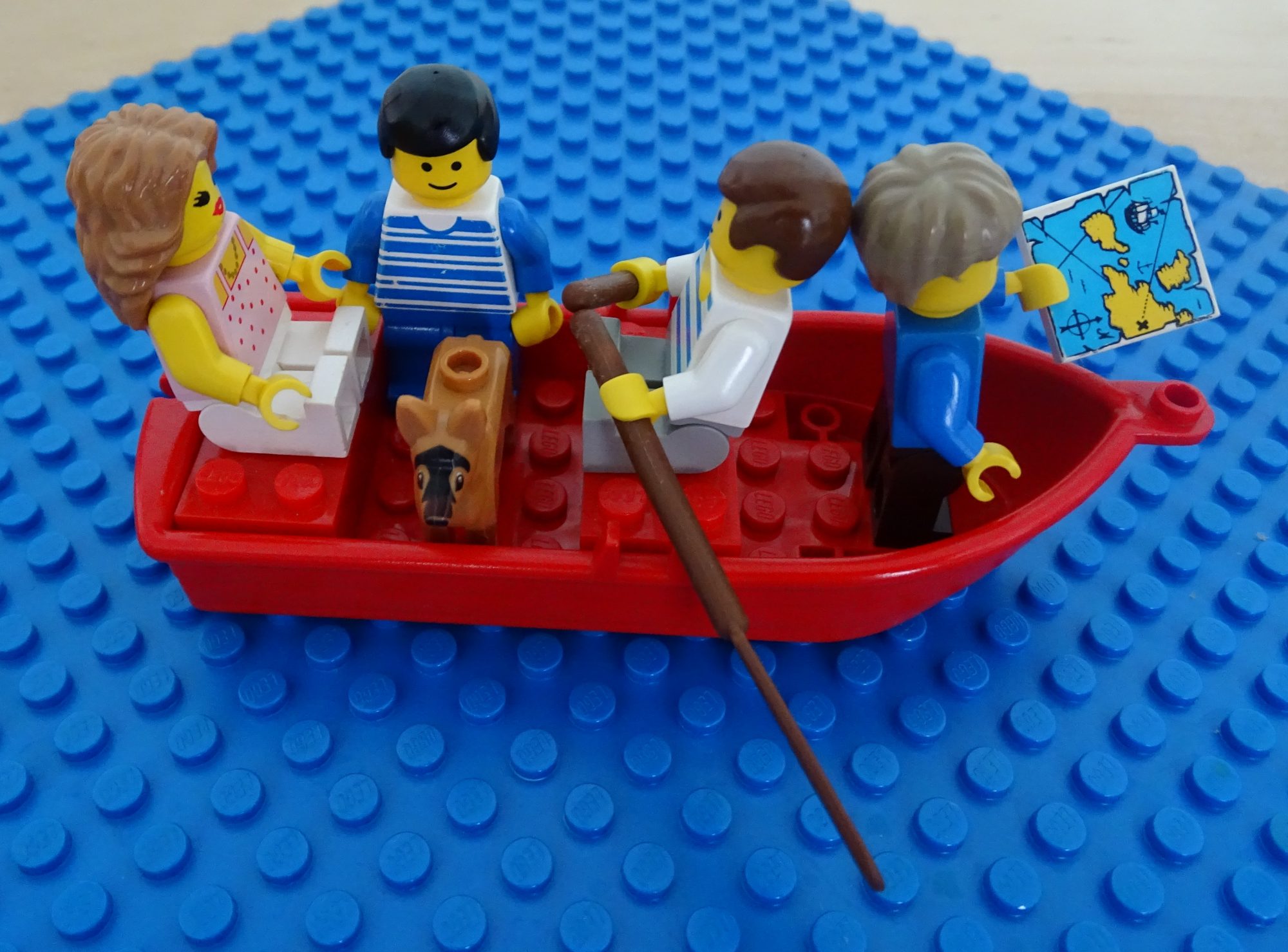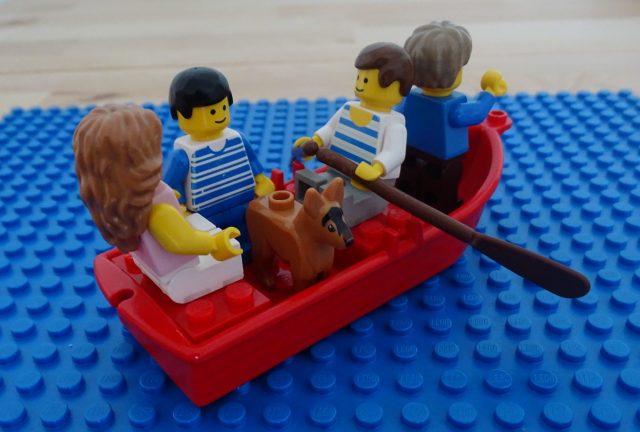 I began with George rowing her cousins over to her island for the first time. (Hair and clothing choices were very limited, I have a lot of space uniforms, pirates and soldiers but 1950s clothing especially for girls was limited. I had to borrow Julian’s blonde hair and Timmy from another cousin).