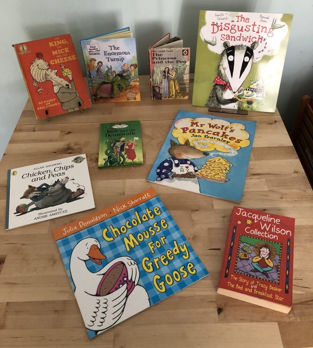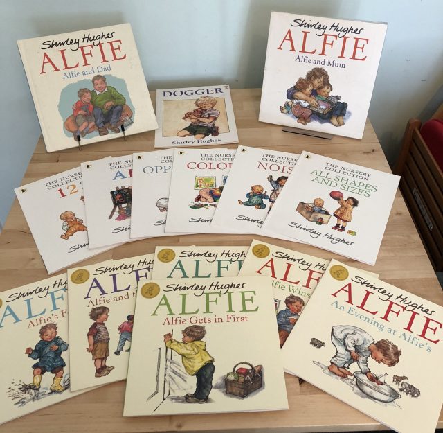 Mostly her Alfie series but also Dogger and some of her nursery collection about learning shapes and colours etc.