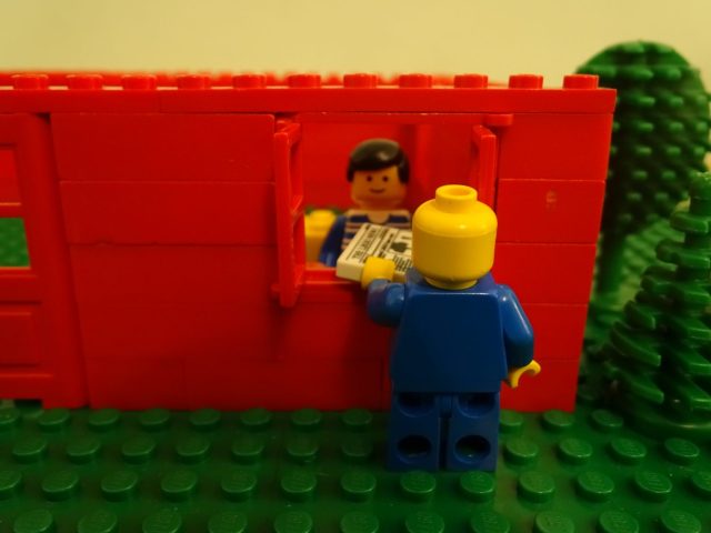 First up Dick sleeps in the barn and is woken by a strange bullet Lego-headed man who gives him a strange message and passes him a mysterious note (represented here by a Lego newspaper).