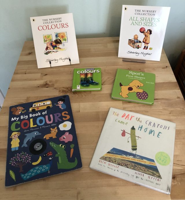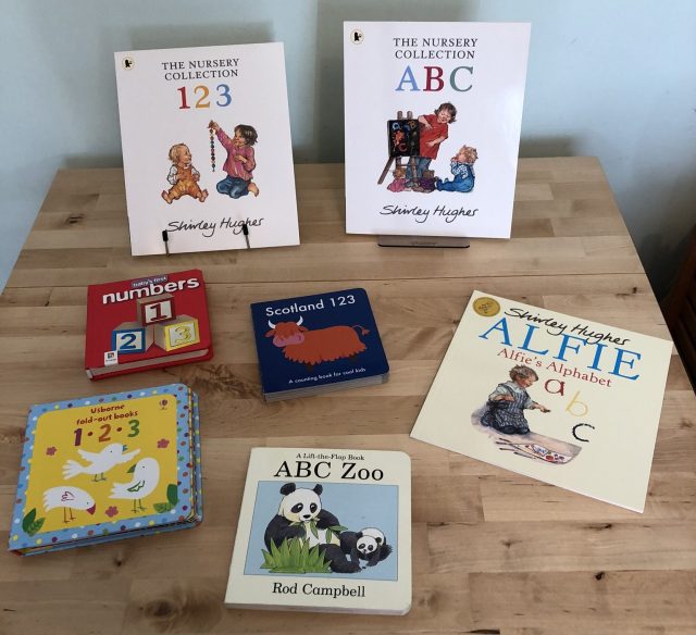 Here is Peepo! (which he is not interested in at all), Baby’s Big Box of Little Books (which make good stacking material as well as reading), Burglar Bill, Each Peach Pear Plum (one of his favourites), The Clothes Horse and Cops and Robbers.
