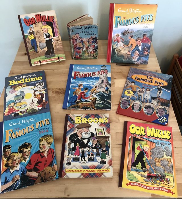 Centre back is Enid Blyton’s Magazine Annual (the first of four) and beside that the 2015 Famous Five Annual, in the middle row are Enid Blyton’s Bedtime Annual 1978, the 2014 Famous Five Annual and the Famous Five Annual based on the 90s TV series, and the front row has the 2015 Famous Five Annual.
