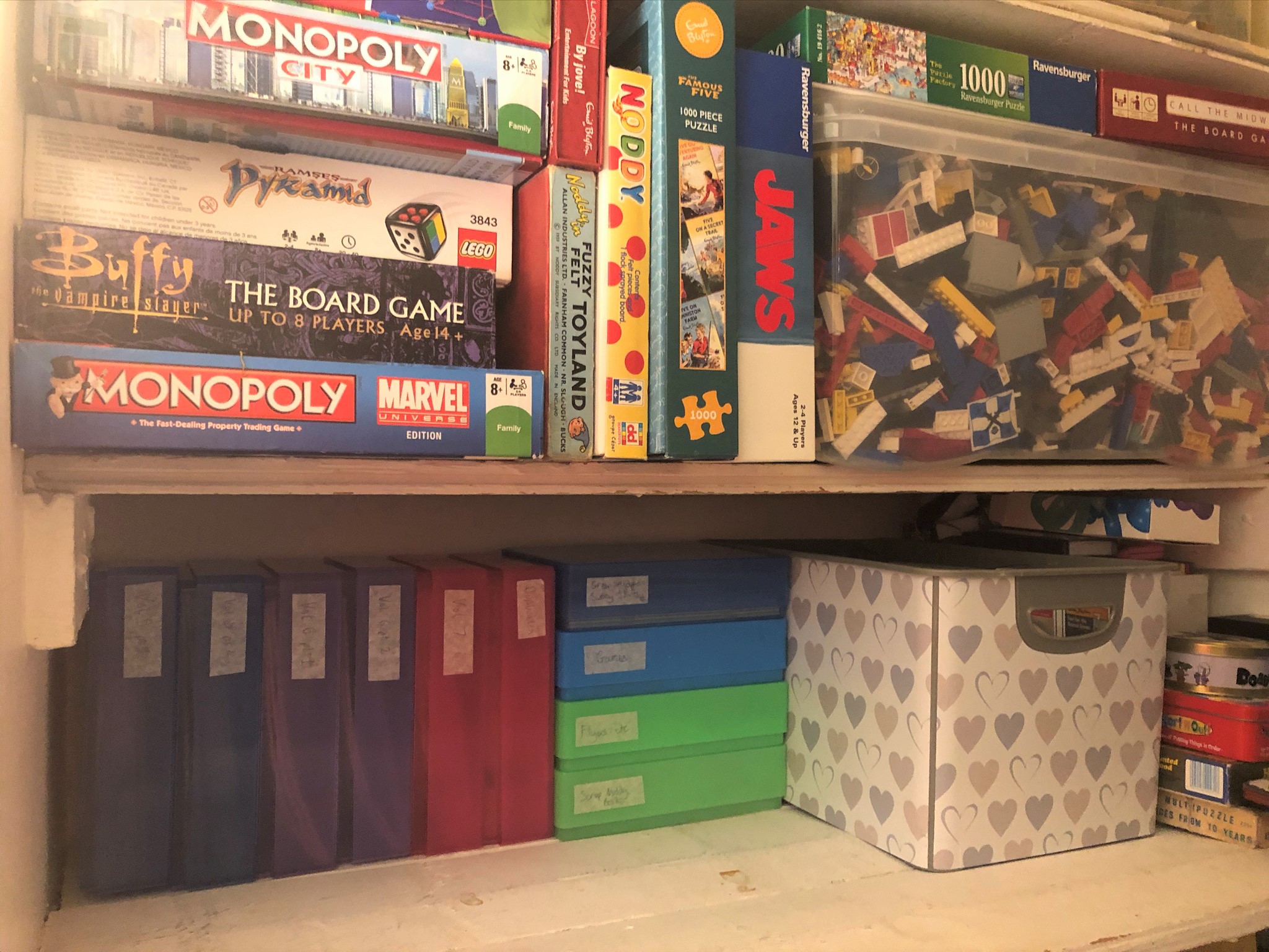 And a wider view. The grey hearts box now holds all my Enid Blyton Society Journals, and above you can see both my Noddy fuzzy felt sets (one from the 50s and one from the 90s), my Famous Five jigsaw and the By Jove! Entertainment For Kids – Five Go Parenting card game. Plus some of my other jigsaws, board games and half of my Lego.