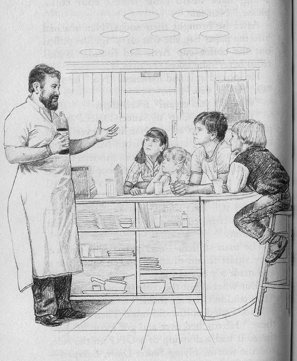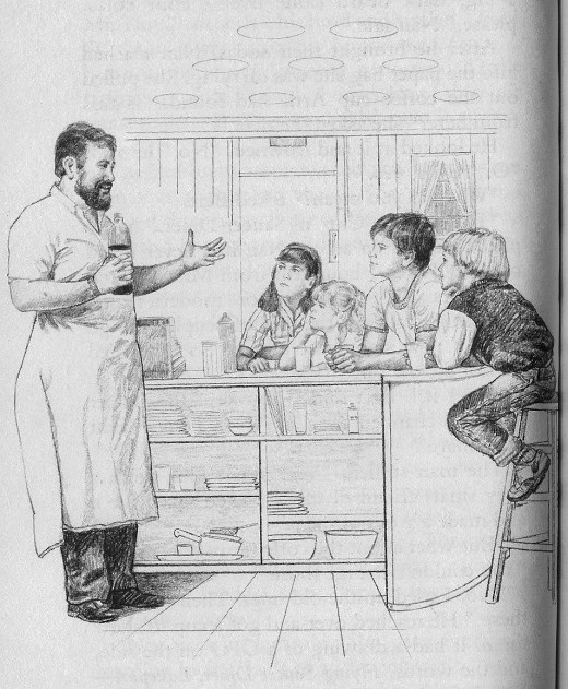 The next day Bert tells his family what he saw, tells the police (who treat him seriously because Lt Pike put in a good word about the twins), and tells the newspaper (who are VERY sceptical), who makes mention of it on the radio. Later, the twins go to Artie’s neighbourhood to look for clues and after crossing the woods, see burnt grass in a clearing that look like two giant footprints! They also find a paper coffee cup from the Cup ‘n Saucer diner, as well as a yogurt container with an unusual brand. On the way back through the woods there is a small road where a motorbike almost runs them over! The driver is a reddish, wild-eyed man who isn’t very nice.