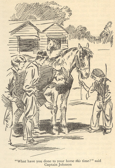 Sniffer is a skinny young boy who brings his horse to be seen by Captain Johnson as it is lame (for some reason when typing the introduction to this post I wrote Tinker, and I also wrote Tinker in my notebook while reading!). Sniffer’s a bit of a sorry character, much abused and beaten by his nasty father. He does have the comfort of his little dog, Liz, though. Sniffer’s father turns up trying to take the horse before it is recovered and has a bit of a stand-off with Julian, though it’s nowhere near as impressive as the ones with Mr Stick.