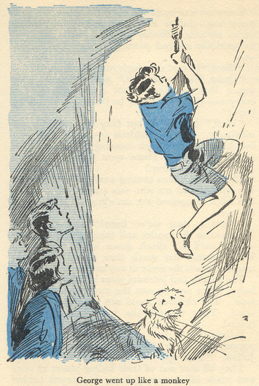 • It’s said that Timmy was the most difficult of all to heave through. George gets boosted up by Julian but also climbs using the ledges, and gets one more push to hoist herself through the hole, so it seems like it would be very difficult to lift a heavy dog like Timmy above their heads and then for whoever was above to haul him through.