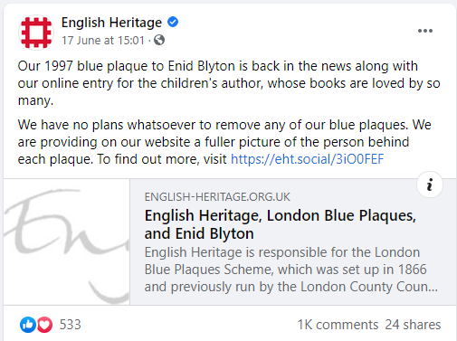 Have a look at these two Facebook posts, from the Daily Express and Daily Mail, respectively. While both, I suspect, are employing hyperbole (the first with Five Get Cancelled is obviously a joke on some level), these are just two examples I could find doing a quick search on Facebook. I saw dozens of posts like like these last week, some using careful language about English Heritage reviewing blue plaques to suggest that Blyton’s might be removed.