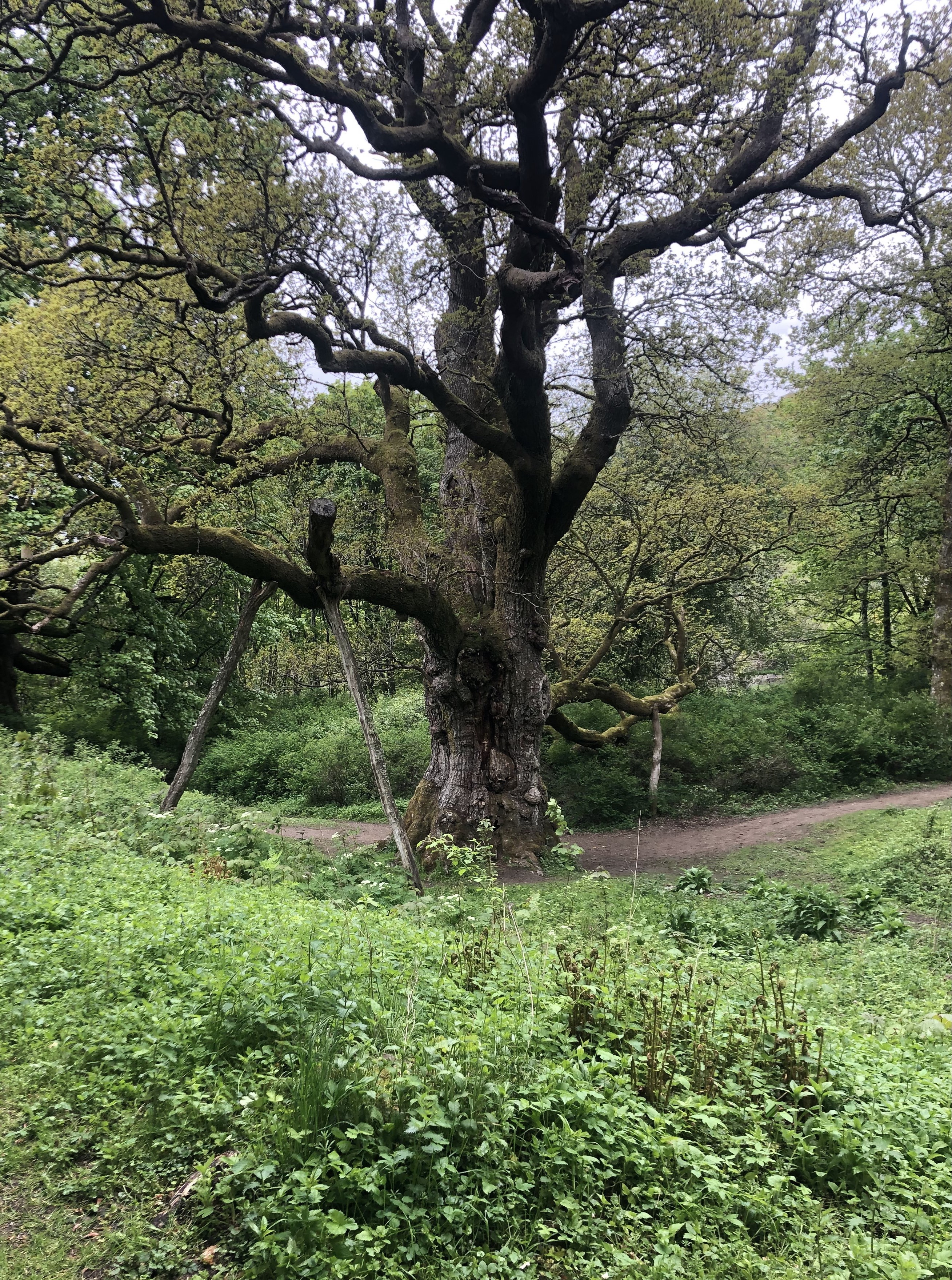 Just like the fictional Hollow Tree House despite missing a significant portion of its trunk the Birnam Oak is still alive – as you can see from the photos it was in leaf when we visited it. It does, however, have its lower branches propped up with wooden stilts to protect them from breaking under their own weight.