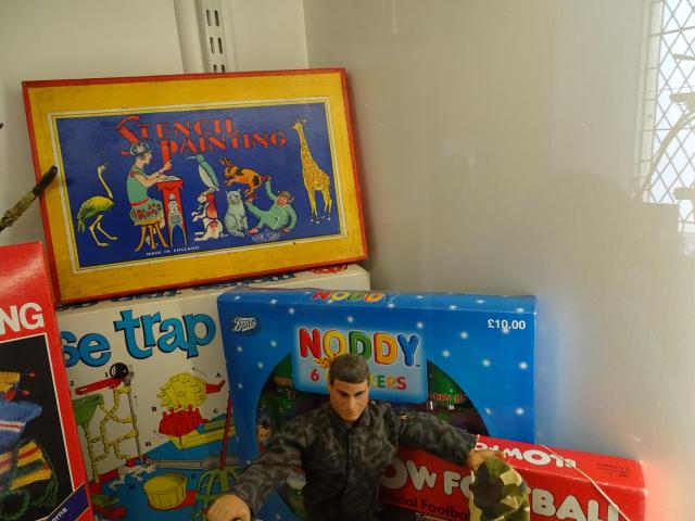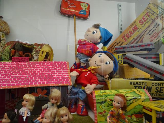 At the far end of the shelf was a Big-Ears in his car, a Noddy and Big-Ears pair of figures, and behind those is the other Toytown pinball game. I didn’t take many photos of the museum in general but here you can see some of the dolls in the case behind, and packs of cards to the left.